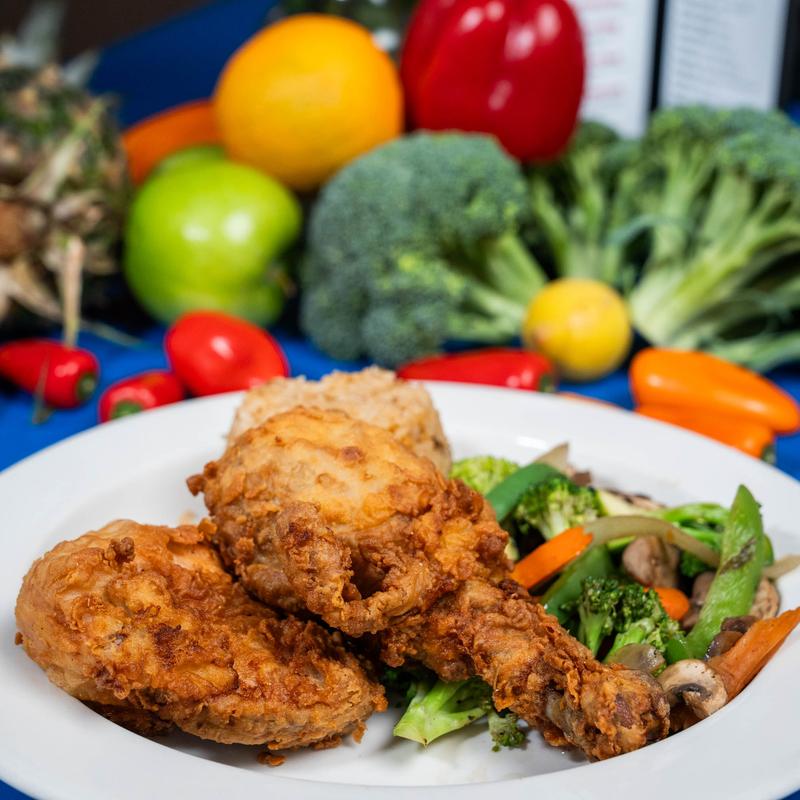 One breast, thigh, leg, and wing with your choice of dirty rice, French fries, mashed potatoes, or seasonal vegetables.