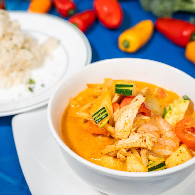 One of the most popular Thai dishes, made with bamboo shoots, pineapple, zucchini, and peppers, served with steamed white rice.