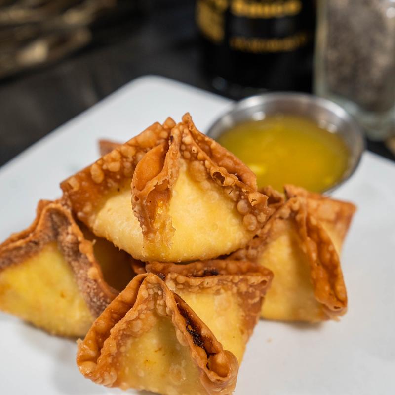 Cream cheese, crab meat, and curry wrapped in a wonton skin and deep-fried until crispy.