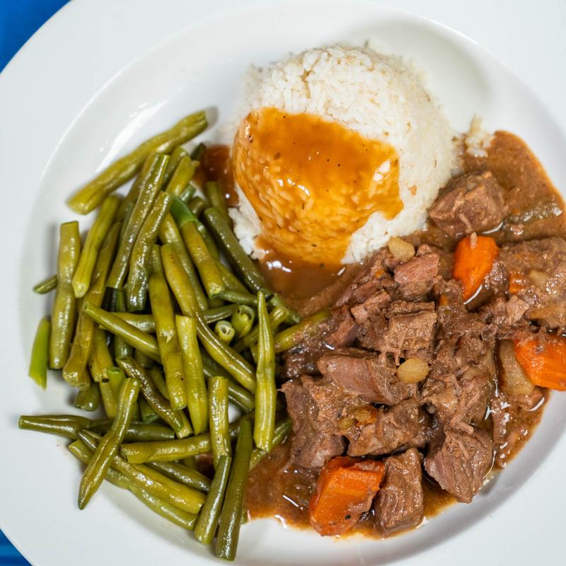 Beef tips served over rice with the vegetable of the day.