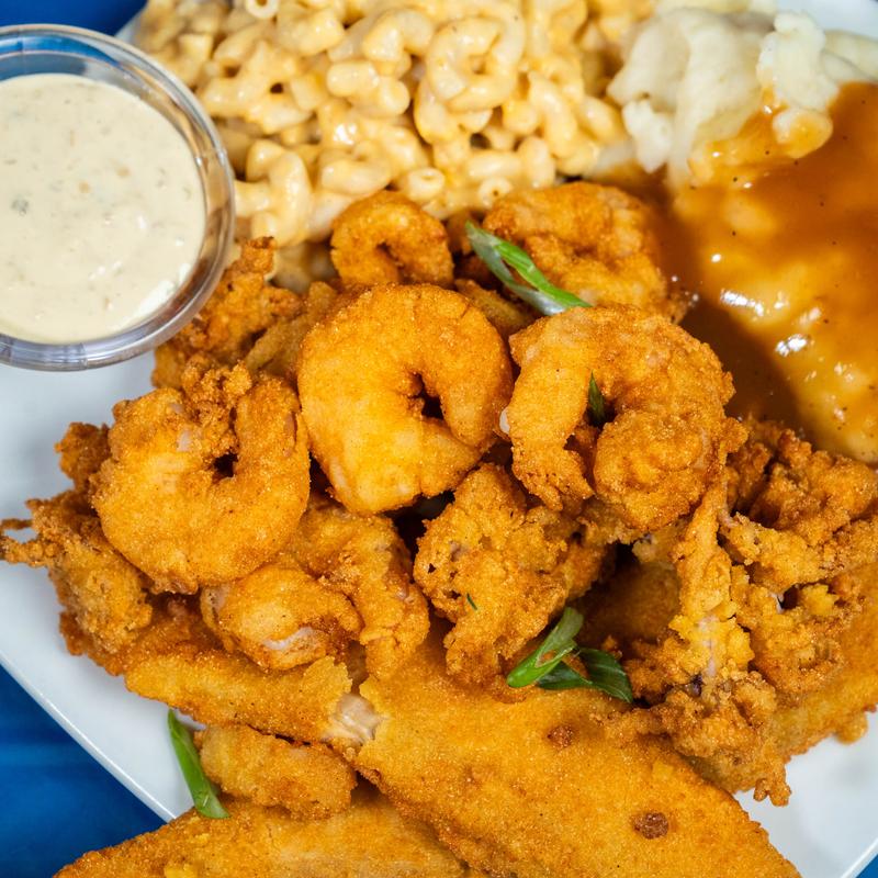 Crispy fried shrimp and fish fillet served with your choice of fries or dirty rice, plus seasonal veggies and coleslaw.